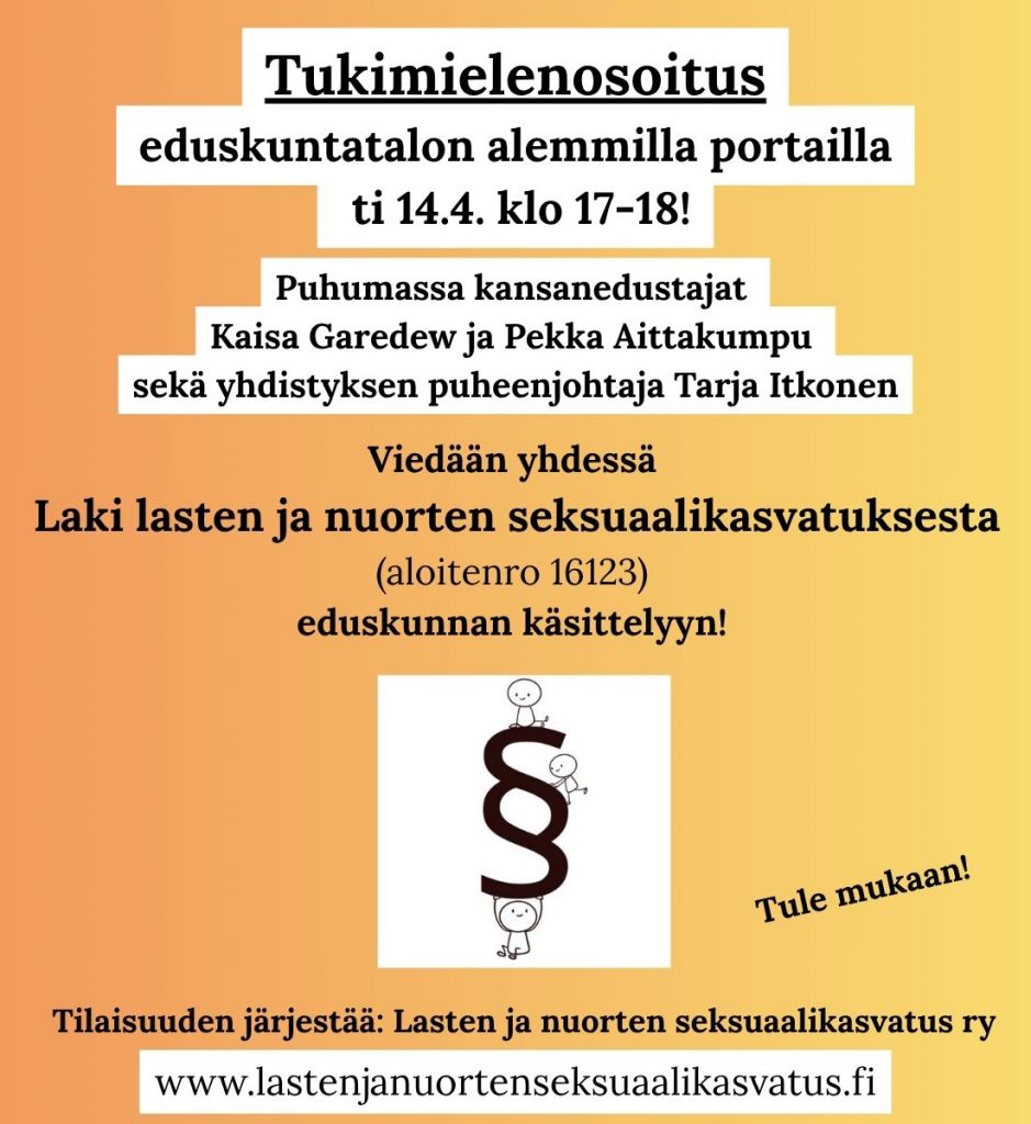 Tule mukaan tukimielenosoitukseen Lasten ja nuorten seksuaalikasvatuslain puolesta! Kokoonnumme Eduskuntatalon portailla tiistaina 14.4.2026 klo 17-18. Luvassa kantaa ottavia puheenvuoroja! Viedään yhdessä ”Laki lasten ja nuorten seksuaalikasvatuksesta” (aloite nro 16123) eduskunnan käsittelyyn!