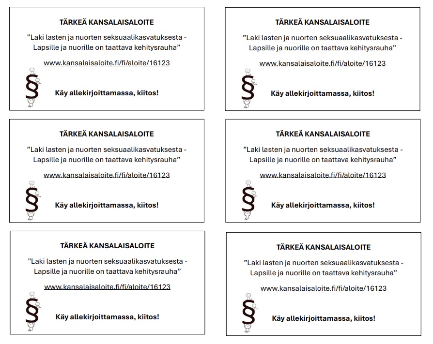 Täältä voit tulostaa ja leikata A4-arkille sopivat kansalaisaloitteen esitteet/flaijerit: