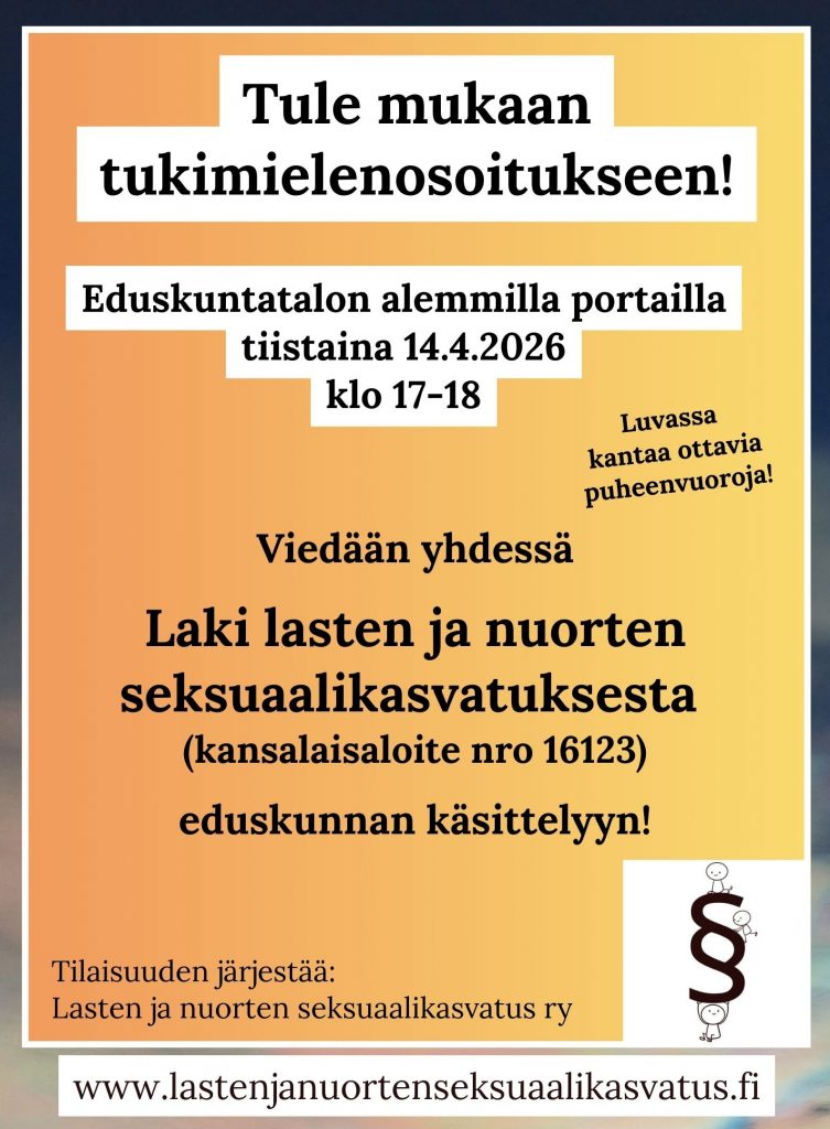 Tule mukaan tukimielenosoitukseen Lasten ja nuorten seksuaalikasvatuslain puolesta! Kokoonnumme Eduskuntatalon portailla tiistaina 14.4.2026 klo 17-18. Luvassa kantaa ottavia puheenvuoroja! Viedään yhdessä ”Laki lasten ja nuorten seksuaalikasvatuksesta” (aloite nro 16123) eduskunnan käsittelyyn!